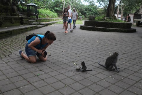 Pengunjung mengabadikan Kera (Macaca fascicularis) di kompleks Pura Dalem Agung Padangtegal, Hutan Kera, Ubud, Bali, Minggu, 29 Juli 2012. – The Jakarta Post / Jerry Adiguna
