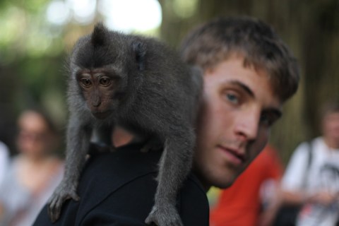 Pengunjung bermain bersama seekor Kera (Macaca fascicularis) di kompleks Pura Dalem Agung Padangtegal, Hutan Kera, Ubud, Bali, Minggu, 29 Juli 2012. – The Jakarta Post / Jerry Adiguna