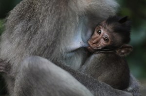 Seekor anak kera (Macaca fascicularis) menyusu dalam gendongan induknya di kompleks Pura Dalem Agung Padangtegal, Hutan Kera, Ubud, Bali, Minggu, 29 Juli 2012. – The Jakarta Post / Jerry Adiguna