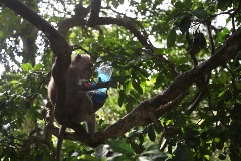 Seekor kera (Macaca fascicularis) duduk memegang botol minuman bersoda di Pura Dalem Agung Padangtegal, Hutan Kera, Ubud, Bali, Minggu, 29 Juli 2012. – The Jakarta Post / Jerry Adiguna