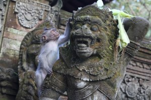 Kera (Macaca fascicularis) duduk di dekat salah satu relief di kompleks Pura Dalem Agung Padangtegal, Hutan Kera, Ubud, Bali, Minggu, 29 Juli 2012. – The Jakarta Post / Jerry Adiguna