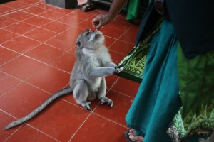 Penjaga memberi makan salah satu kera (Macaca fascicularis) di kompleks Pura Dalem Agung Padangtegal, Hutan Kera, Ubud, Bali, Minggu, 29 Juli 2012. – The Jakarta Post / Jerry Adiguna