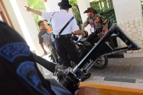 Petugas keamanan menunjukkan surat pemberitahuan kepada pengemudi kendaraan roda dua yang hendak memasuki kawasan Nusa Dua, Bali, tempat yang akan menjadi lokasi penyelenggaraan KTT APEC 2013, Rabu, 2 Oktober 2013. Sebagai bagian usaha antisipasi dan peningkatan kewaspadaan petugas keamanan KTT APEC di Nusa Dua mulai memberlakukan larangan bagi pengendara kendaraan roda dua dan kendaraan tanpa dilengkapi identitas resmi APEC untuk masuk ke lokasi Nusa Dua, Bali. – The Jakarta Post / Jerry Adiguna